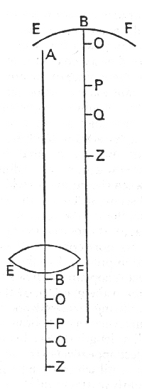 'I have here delivered what my thoughts have suggested to me concerning that part of optics which is more properly mathematical. As for the other parts of that science (which being rather physical, do consequently abound with plausible conjectures instead of certain principles), there has in them scarce anything occur'd to my observation different from what has been already said by Kepler, Scheinerus, Descartes, and others. And methinks, I had better say nothing at all), than repeat that which has been so often said by others. I think it therefore high time to take my leave of this subject: but before I quit it for good and all, the fair and ingenuous dealing that I owe both to you and to truth obligeth me to acquaint you with a certain untoward difficulty, which seems directly opposite to the doctrine I have been hitherto inculcating, at least, admits of no solution from it. In short it is this. Before the double convex glass or concave speculum EBF, let the point A be placed at such a distance that the rays proceeding from A, after refraction or reflexion, be brought to unite somewhere in the AxAB. And suppose the point of union (i.e. the image of the point A, as hath been already set forth) to be Z; between which and B, the vertex of the glass or speculum, conceive the eye to be anywhere placed. The question now is, where the point A ought to appear? Experience shews that it does not appear behind at the point Z, and it were contrary to nature that it should, since all the impression which affects the sense comes from towards A. But from our tenets it should seem to follow that it would appear before the eye at a vast distance off, so great as should in some sort surpass all sensible distance. For since if we exclude all anticipations and prejudices, every object appears by so much the farther off, by how much the rays it sends to the eye are less diverging. And that object is thought to be most remote from which parallel rays proceed unto the eye. Reason would make one think that object should appear at yet a greater distance which is seen by converging rays. Moreover it may in general be asked concerning this case what it is that determines the apparent place of the point A, and maketh it to appear after a constant manner sometimes nearer, at other times farther off? To which doubt I see nothing that can be answered agreeable to the principles we have laid down except only that the point A ought always to appear extremely remote. But on the contrary we are assured by experience that the point A appears variously distant, according to the different situations of the eye between the points B and Z. And that it doth never (if at all) seem farther off, than it would if it were beheld by the naked eye, but on the contrary it doth sometimes appear much nearer. Nay, it is even certain that by how much the rays falling on the eye do more converge by so much the nearer doth the object seem to approach. For the eye being placed close to the point B, the object A appears nearly in its own natural place, if the point B is taken in the glass, or at the same distance, if in the speculum. The eye being brought back to O, the object seems to draw near: and being come to P it beholds it still nearer. And so on little and little, till at length the eye being placed somewhere, suppose at Q, the object appearing extremely near, begins to vanish into mere confusion. All which doth seem repugnant to our principles, at least not rightly to agree with them. Nor is our tenet alone struck at by this experiment, but likewise all others that ever came to my knowledge are, every whit as much, endangered by it. The ancient one especially (which is most commonly received, and comes nearest to mine) seems to be so effectually overthrown thereby that the most learned Tacquet has been forced to reject that principle, as false and uncertain, on which alone he had built almost his whole Catoptrics; and consequently by taking away the foundation, hath himself pulled down the superstructure he had raised on it. Which, nevertheless, I do not believe he would have done had he but considered the whole matter more thoroughly, and examined the difficulty to the bottom. But as for me, neither this nor any other difficulty shall have so great an influence on me as to make me renounce that which I know to be manifestly agreeable to reason: especially when, as it here falls out, the difficulty is founded in the peculiar nature of a certain odd and particular case. For in the present case something peculiar lies hid, which being involved in the subtilty of nature will, perhaps, hardly be discovered till such time as the manner of vision is more perfectly made known. Concerning which, I must own, I have hitherto been able to find out nothing that has the least shew of probability, not to mention certainty. I shall, therefore, leave this knot to be untied by you, wishing you may have better success in it than I have had.'