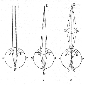 35. Secondly, suppose in the adjacent figures NP represent an eye duly framed and retaining its natural figure. In Fig. 1 the rays falling nearly parallel on the eye, are by the crystalline AB refracted, so as their focus or point of union F falls exactly on the retina: but if the rays fall sensibly diverging on the eye, as in Fig. 2, then their focus falls beyond the retina: or if the rays are made to converge by the lens QS before they come at the eye, as in Fig. 3, their focus F will fall before the retina. In which two last cases it is evident fromt [sic] the foregoing section that the appearance of the point Z is confused. And by how much the greater is the convergency, or divergency, of the rays falling on the pupil, by so much the farther will the point of their reunion be from the retina, either before or behind it, and consequently the point Z will appear by so much the more confused. And this, by the bye, may shew us the difference between confused and faint vision. Confused vision is when the rays proceedings from each distinct point of the object are not accurately recollected in one corresponding point on the retina, but take up some space thereon, so that rays from different points become mixed and confused together. This is opposed to a distinct vision, and attends near objects. Faint vision is when by reason of the distance of the object or grossness of the interjacent medium few rays arrive from the object to the eye. This is opposed to vigorous or clear vision, and attends remote objects. But to return.