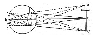 34. First, any radiating point is then distinctly seen when the rays proceeding from it are, by the refractive power of the crystalline, accurately reunited in the retina or fund of the eye: but if they are reunited, either before they arrive at the retina, or after they have passed it, then there is confused vision.