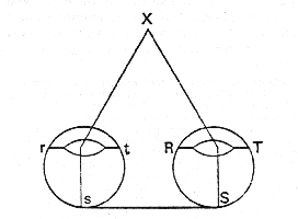 [8] We apprehend distance, moreover, through a sort of joint activity of the eyes. For in the same way as our blind man, holding two sticks of indeterminate length, AE and CE, and knowing only the distance between his hands, A and C, together with the size of the angles ACE and CAE, can thence determine the position of E by a sort of innate geometrical knowledge shared by all men, so, when both our eyes, RST and rst, are focused on X, the length of the line Ss and the size of the angles XSs and XsS let us know the position of the point X. We can also discover that position by means of either one of our eyes alone, by changing its location. If we keep the eye fixed on X and hold it first at point S and then immediately afterwards at point s, that will be enough for the length of the line Ss and the size of the angles XSs and XsS to be present together in the imagination and thus to inform us of the distance of the point X. They do so in virtue of an act of the mind which, while it may seem to be a simple judgment, nevertheless includes within itself a certain reasoning process like that by which geometers calculate inaccessible positions from two separate given points. [From Descartes' Dioptrics, VI, 13.]